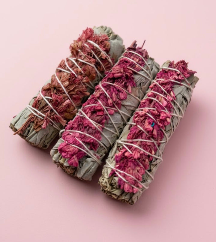 This white sage smudge stick includes a mini pebblesย ofย rose quartz.